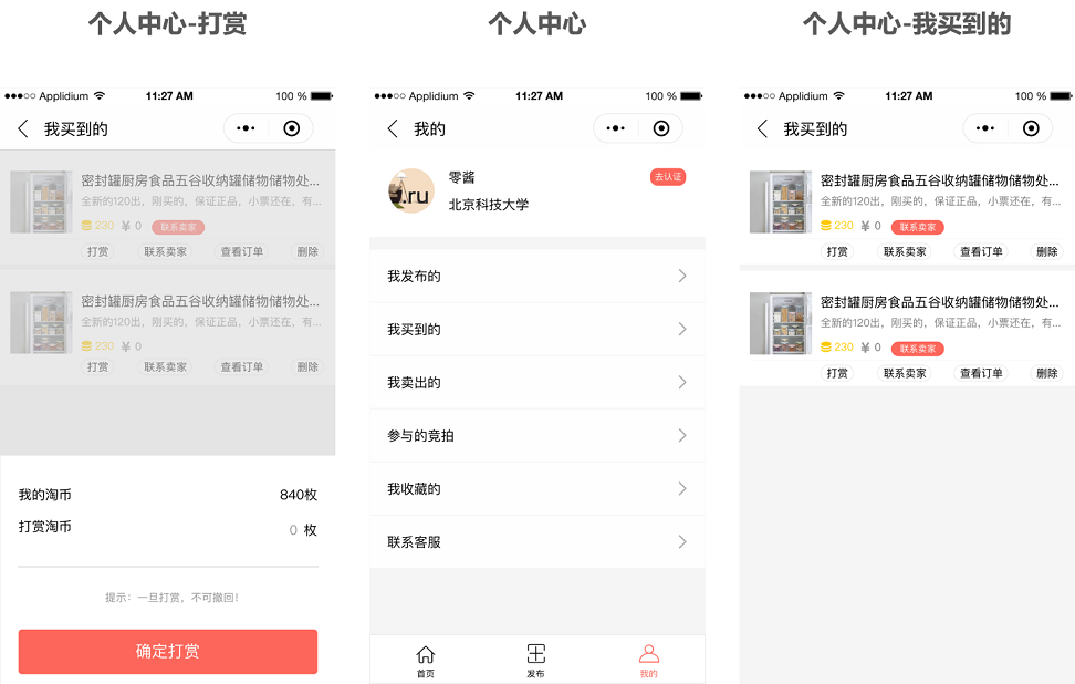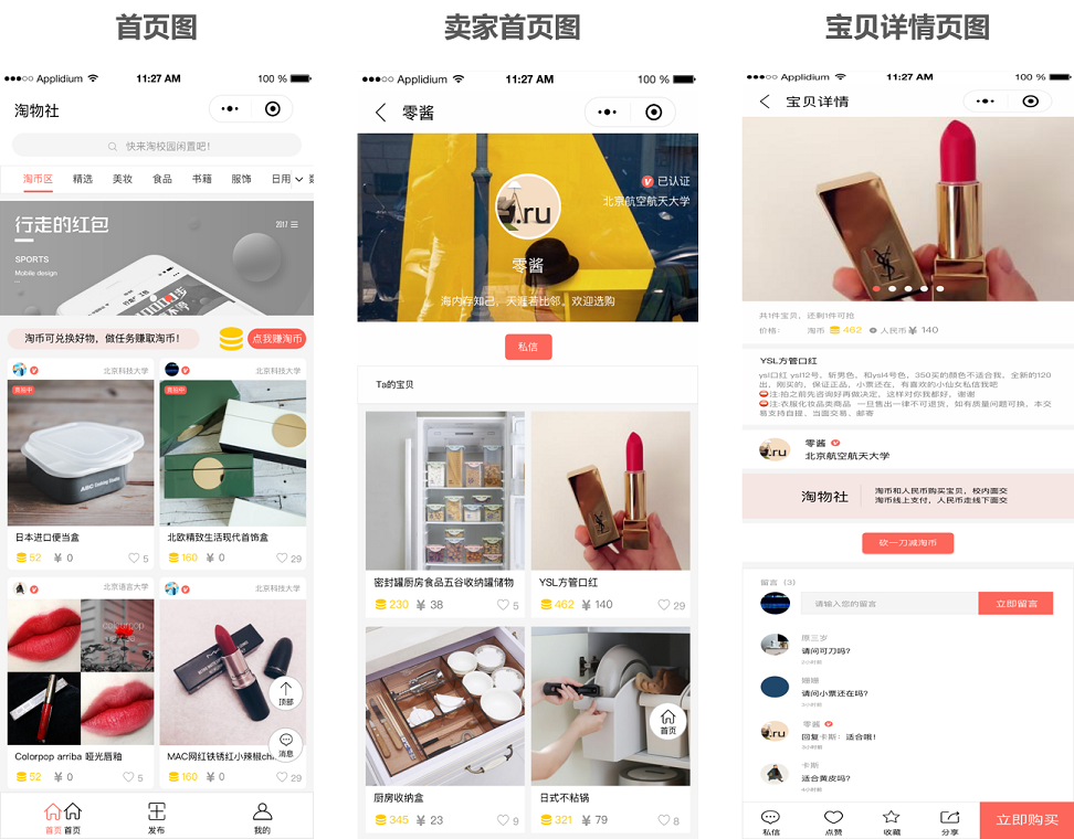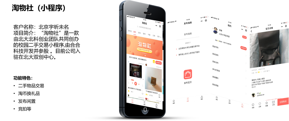 “淘物社”是一款由北大、北科創(chuàng)業(yè)團(tuán)隊(duì)共同創(chuàng)辦,由北京合合科技承接開(kāi)發(fā)的校園二手交易小程序,團(tuán)隊(duì)成員來(lái)自清華、北大、科大、滴滴、京東等高校及名企。該創(chuàng)業(yè)項(xiàng)目現(xiàn)已獲得個(gè)人種子輪投資,總用戶數(shù)千,日活數(shù)百,并已獲得北京大學(xué)全球創(chuàng)新創(chuàng)業(yè)中心加速孵化資格和北科大“種子計(jì)劃”優(yōu)秀項(xiàng)目。