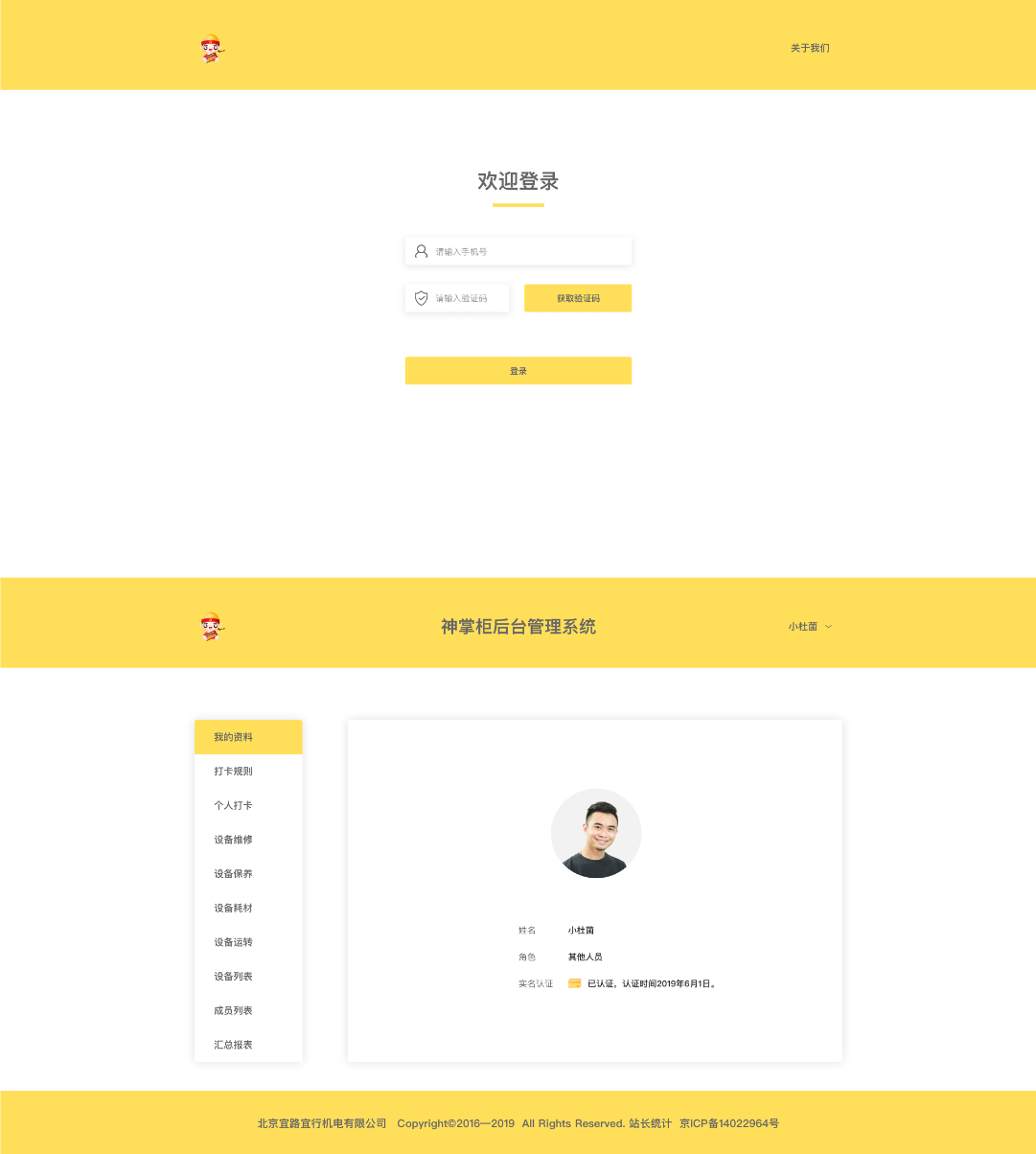 神掌柜小程序是幫助客戶開發(fā)的一款進行施工管理的小程序,包括了添加設備、保養(yǎng)、維修、耗材記錄、查看周邊設備、施工日記等,施工人員還可以通過小程序進行打卡。神掌柜分為PC的管理端與手機小程序端,PC管理端,可以實現對施工人員的管理及記錄,包括了我的資料、打卡規(guī)則、個人打卡、設備維修、設備保養(yǎng)、設備耗材、設備運轉、設備列表、成員列表、匯總列表等項目。(其中UI設計方面根據客戶需求進行了相關調整)