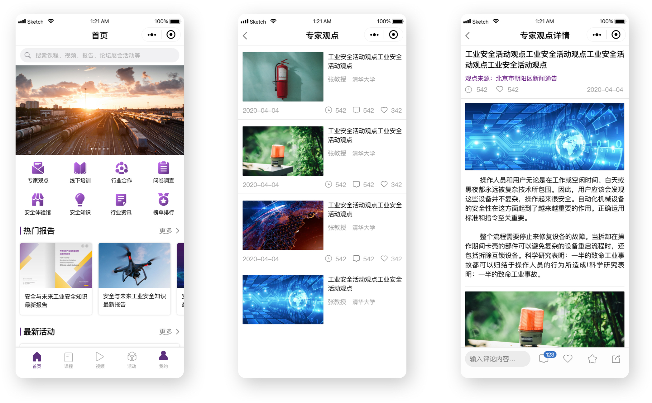 “安全與未來”首頁包括輪播圖、包括專家觀點(diǎn)、線下培訓(xùn)、行業(yè)合作、問卷調(diào)查、安全體驗(yàn)館、安全知識、行業(yè)資訊、榜單排行等入口;往下翻看,包括了熱門報(bào)告、最新活動(dòng)、熱門課程、最新視頻等內(nèi)容。