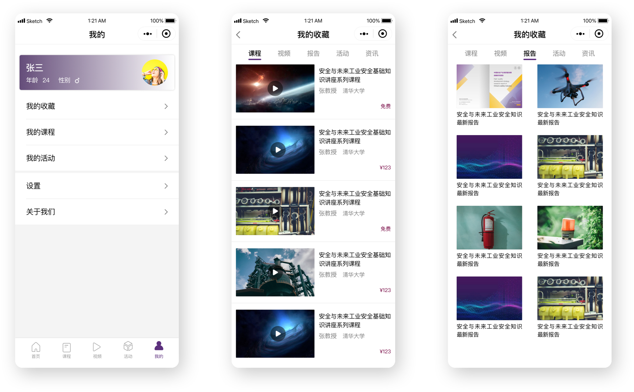 “安全與未來”我的功能列表包括我的收藏,在觀看視頻時(shí),點(diǎn)擊收藏按鈕,可以將收藏內(nèi)容顯示在這里,還有我的課程,可以查看我的播放記錄,以及購買過的課程;還包括我的活動(dòng),可以顯示我報(bào)名的熱門活動(dòng),論壇會議、展會等;另外就是小程序設(shè)置以及關(guān)于“安全與未來”的介紹內(nèi)容。