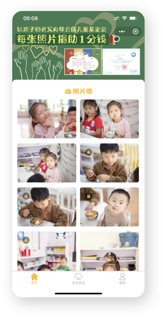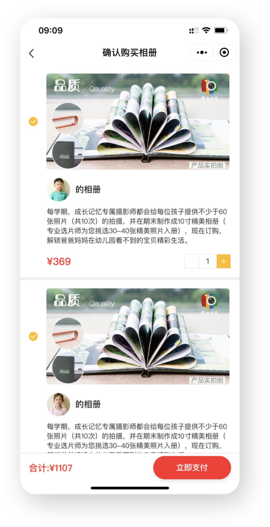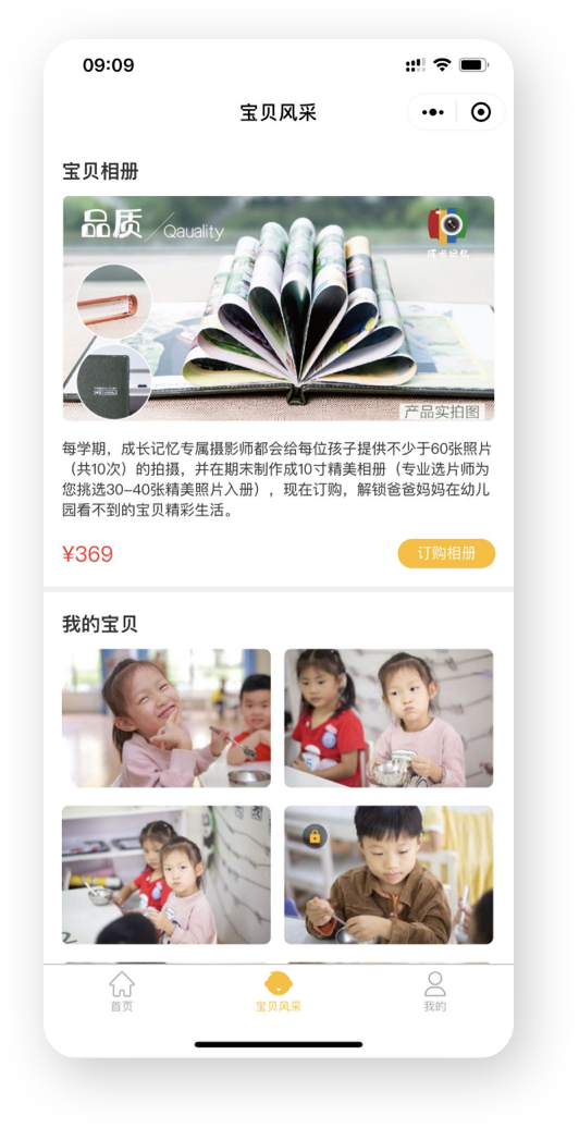 3、家長(zhǎng)可以進(jìn)行相冊(cè)的購(gòu)買,成長(zhǎng)記憶提供照片精修入冊(cè):