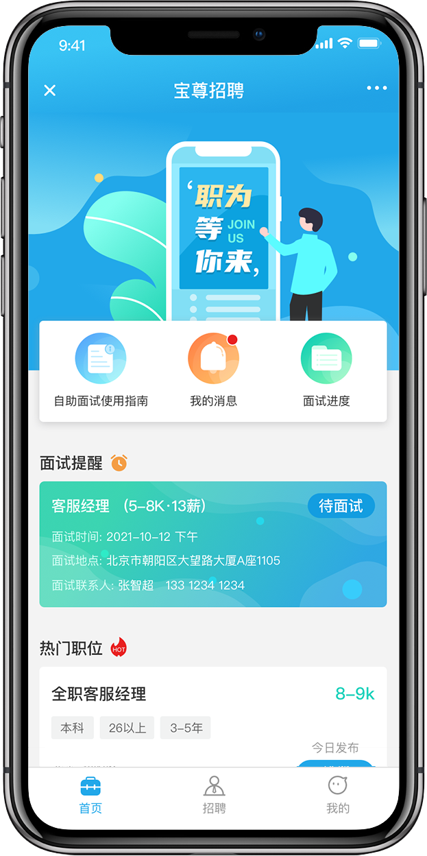 最上面為整體展示的輪播圖,下面主要包括自助面試使用指南,我的消息、面試進(jìn)度;中間是面試提醒,如果有待面試信息,就會(huì)展示在這里,再下面是招聘崗位的展示。對(duì)于應(yīng)聘人員可以打開(kāi)查看崗位,選擇一鍵投遞。