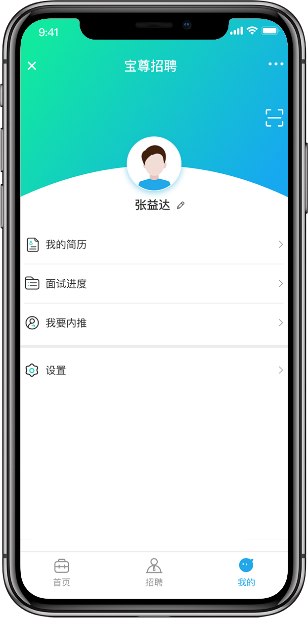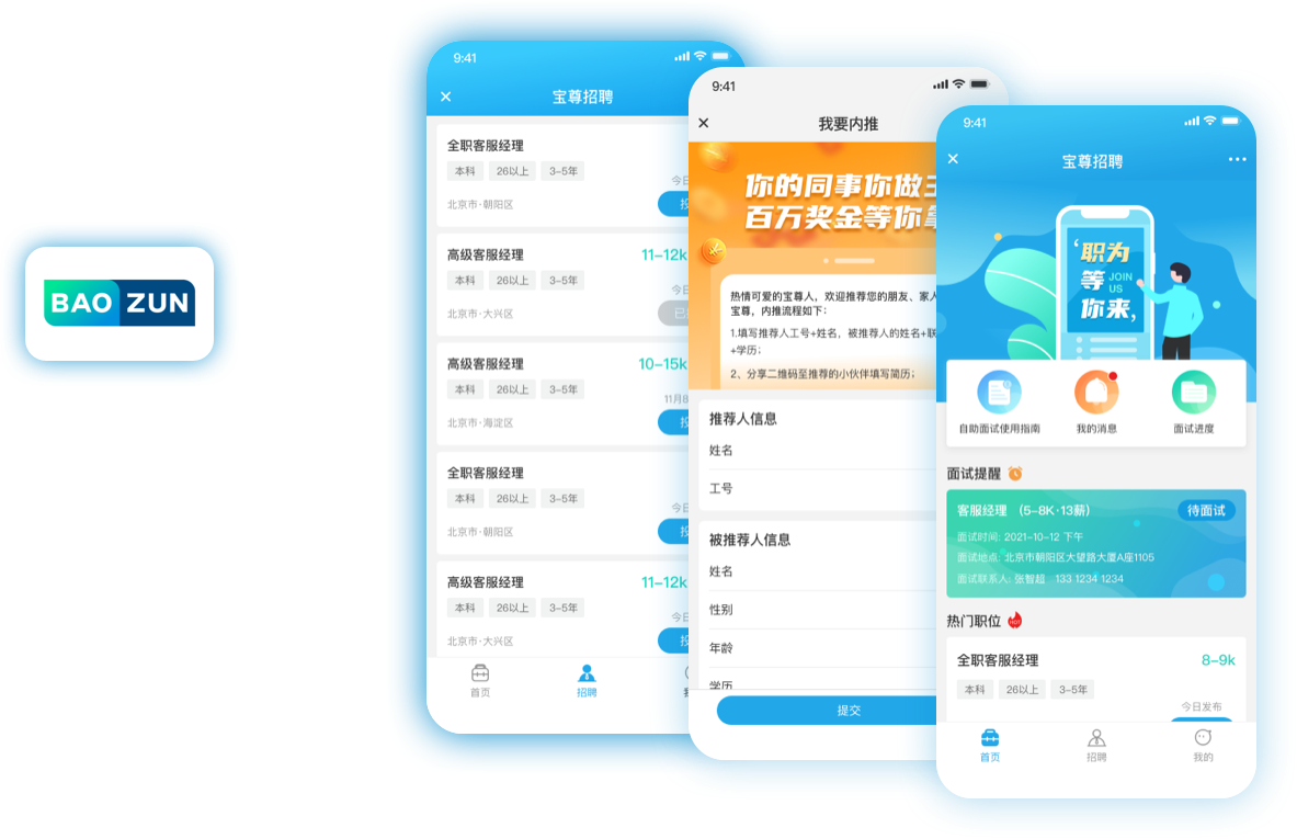 主要是登錄寶尊公眾號(hào)后,進(jìn)入招聘功能的用戶,我的部分主要是展示我的簡(jiǎn)歷、面試進(jìn)度、我要內(nèi)推和設(shè)置功能。