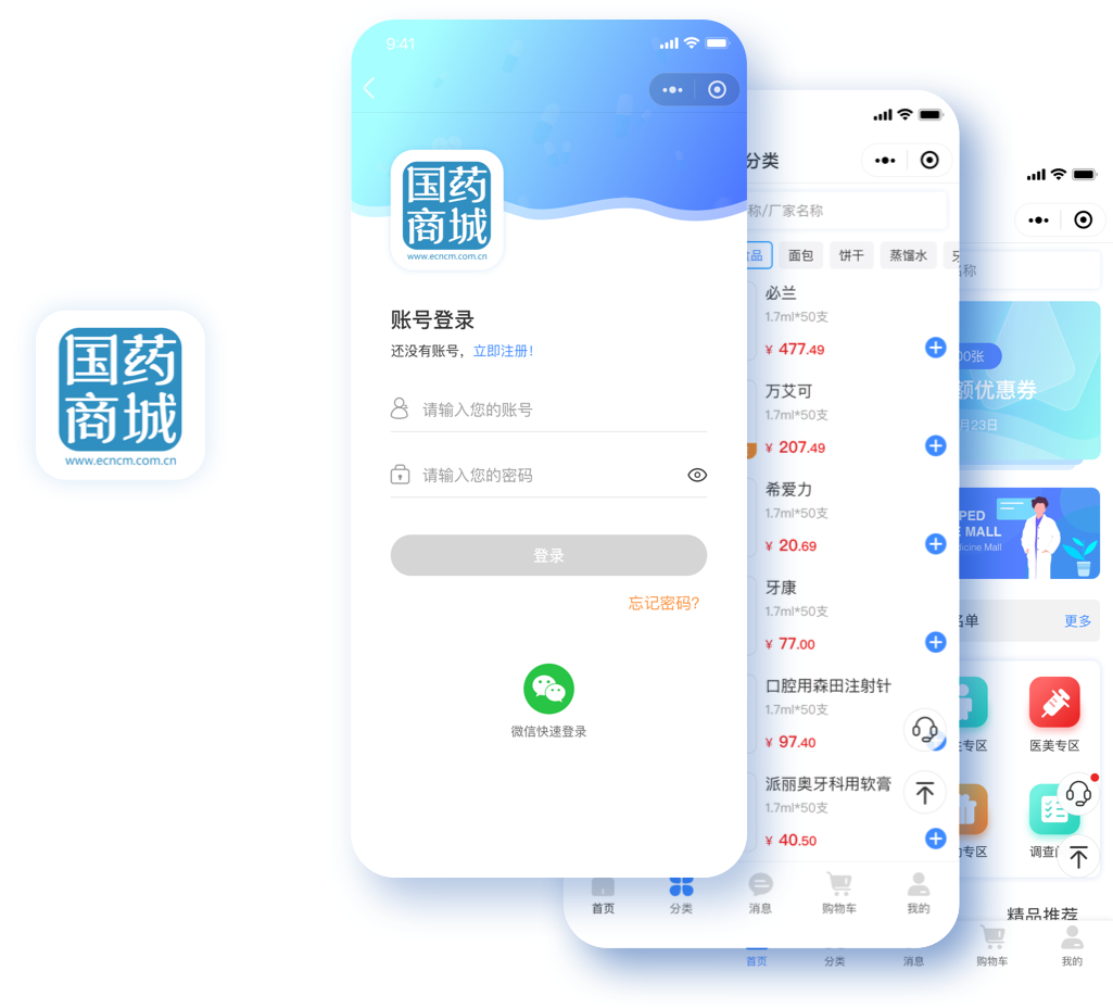 國藥集團(tuán)是由國務(wù)院國資委直接管理的中國規(guī)模最大、產(chǎn)業(yè)鏈最全、綜合實力最強(qiáng)的醫(yī)藥健康產(chǎn)業(yè)集團(tuán),以預(yù)防治療和診斷護(hù)理等健康相關(guān)產(chǎn)品的分銷、零售、研發(fā)及生產(chǎn)為主業(yè)。北京合合科技承接的國藥集團(tuán)的商城小程序項目開發(fā),內(nèi)容和設(shè)計如下。