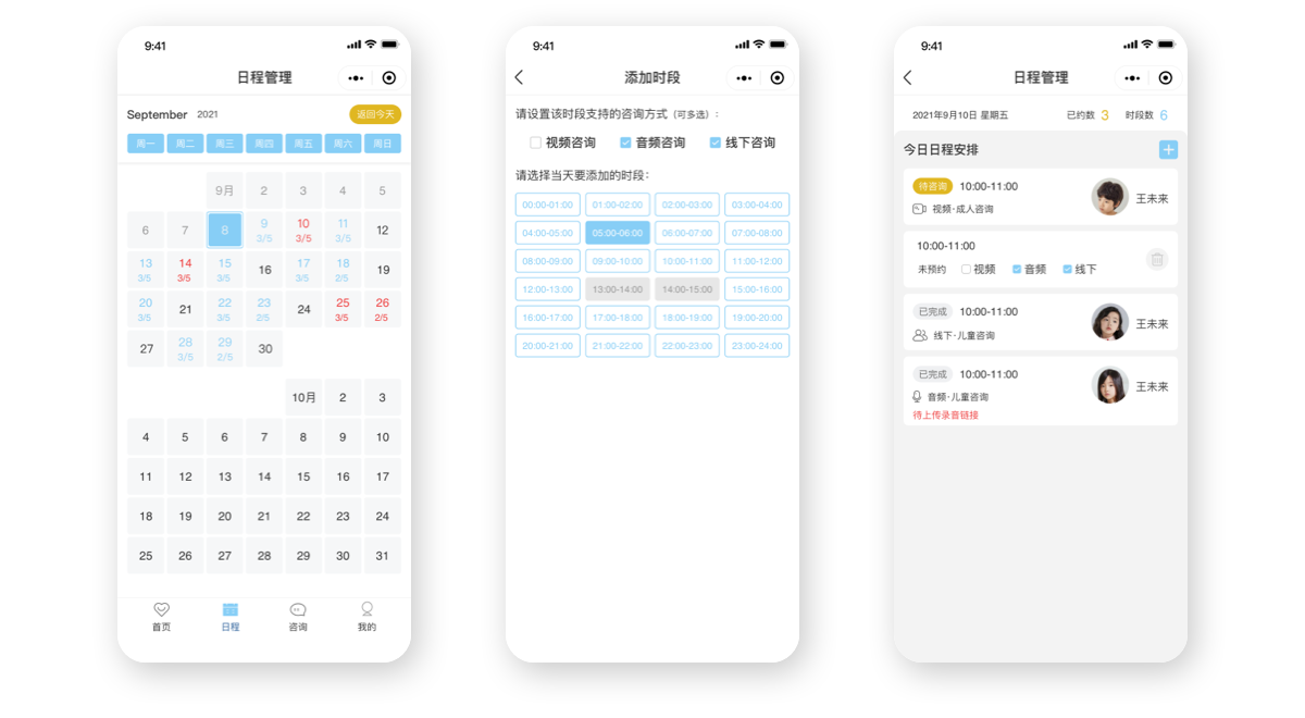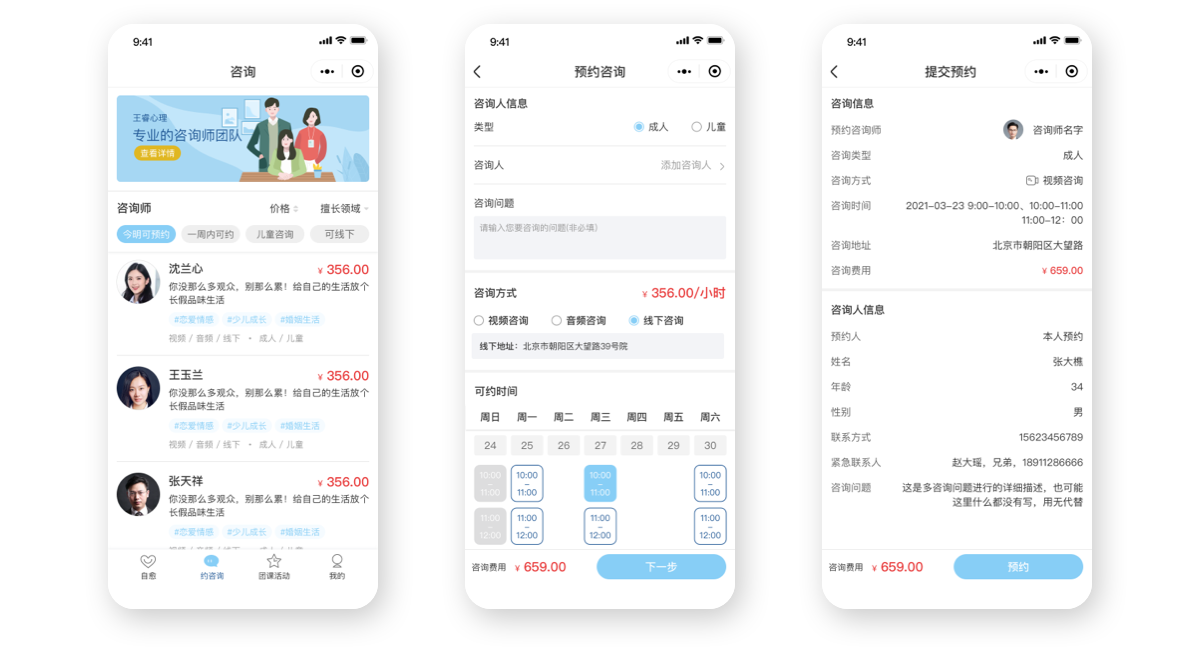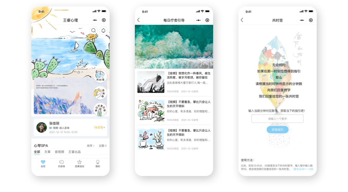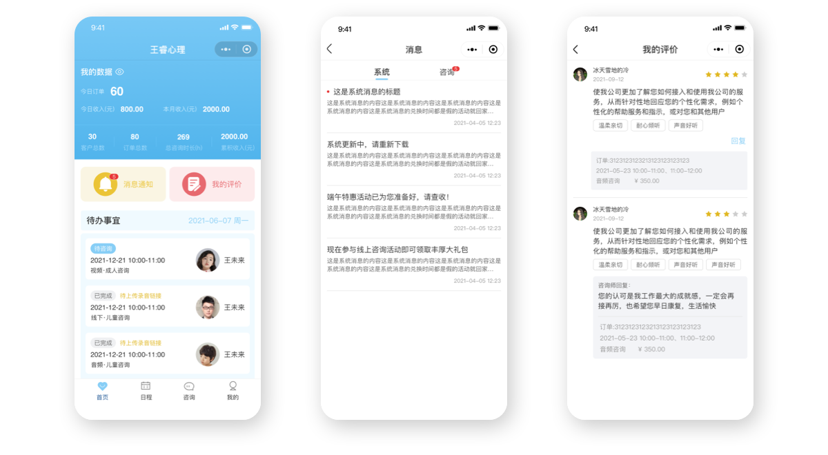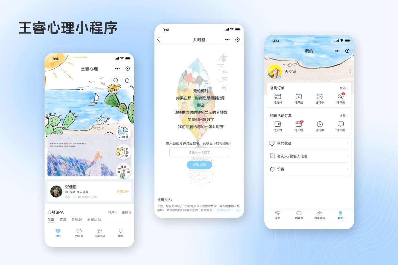 王睿心理咨詢小程序是為王睿心理咨詢工作室開發(fā)的,包含咨詢師端和用戶端兩個端口的線上心理咨詢小程序??梢詭椭湓谛睦碜稍冾I(lǐng)域開展更多心理服務(wù)。下面是王睿心理小程序的相關(guān)頁面介紹。