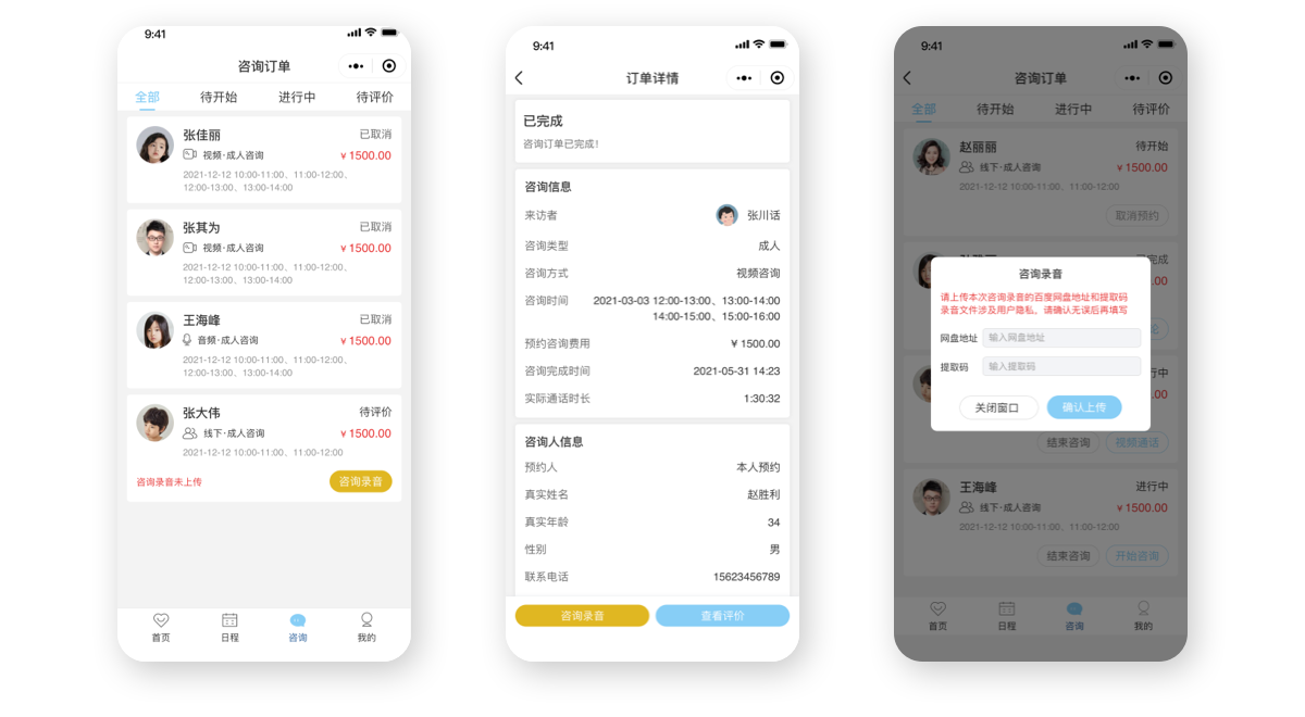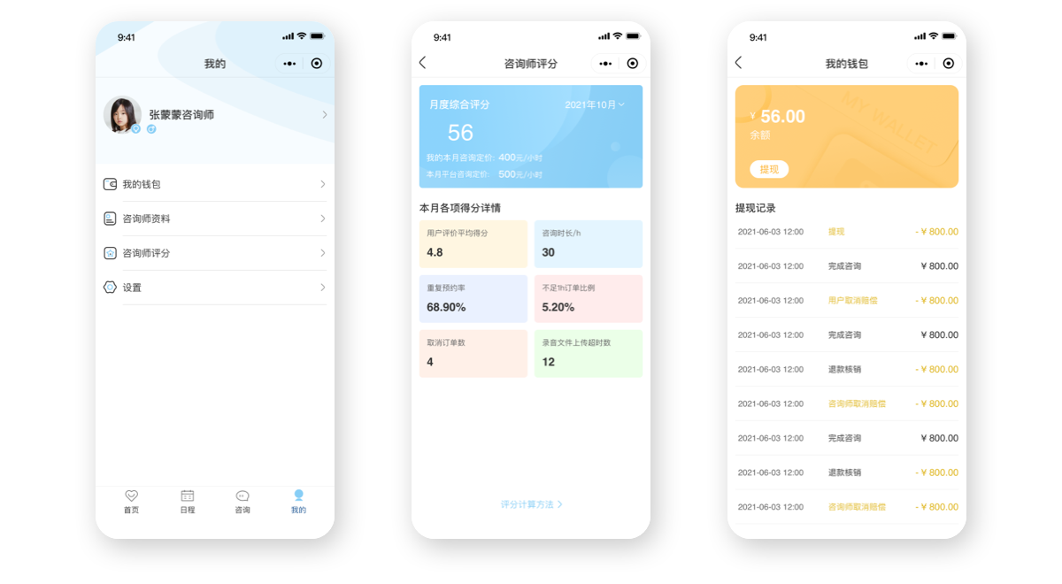 1、首頁可以展示咨詢師端,總覽訂單數(shù)量、收入情況、總咨詢時(shí)長、累積收入、帶咨詢訂單等。