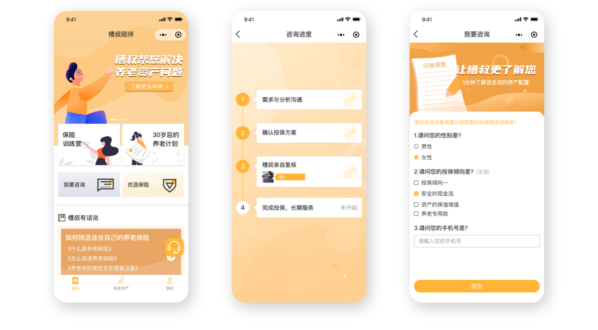 槽叔有話說小程序,是以問診的形式快速解決新客戶保險(xiǎn)訴求,有針對(duì)性出具規(guī)劃方案的小程序,主要實(shí)現(xiàn)保險(xiǎn)新客戶在線保險(xiǎn)問診咨詢.實(shí)現(xiàn)保險(xiǎn)方案在線規(guī)劃,老客戶信息存儲(chǔ)。