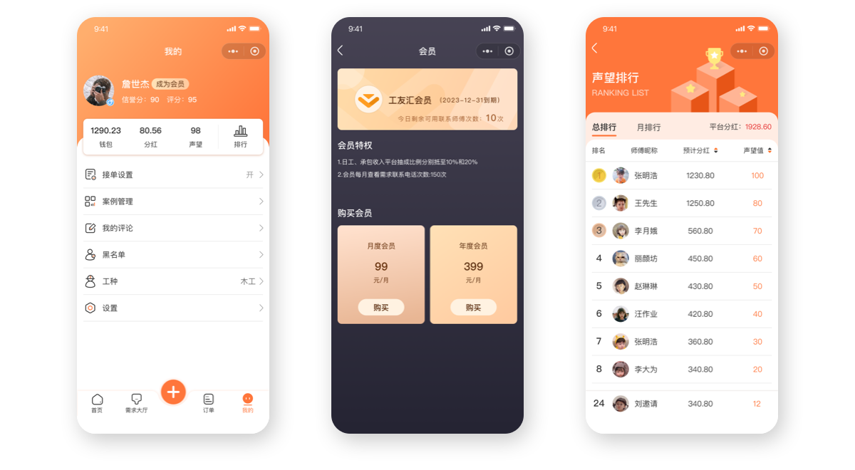我的頁(yè)面展示包括我的信用分、評(píng)分等;成為師傅(可以申請(qǐng)成為裝修師傅)、我的評(píng)論、我的案例、我的接單設(shè)置、黑名單、設(shè)置等。
