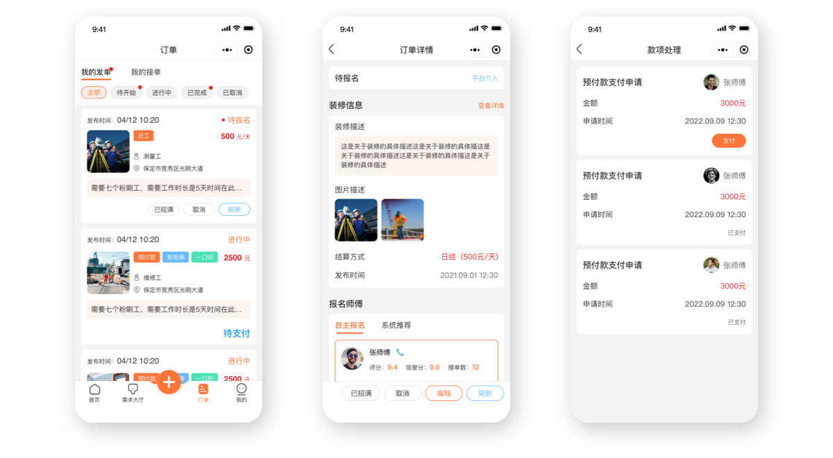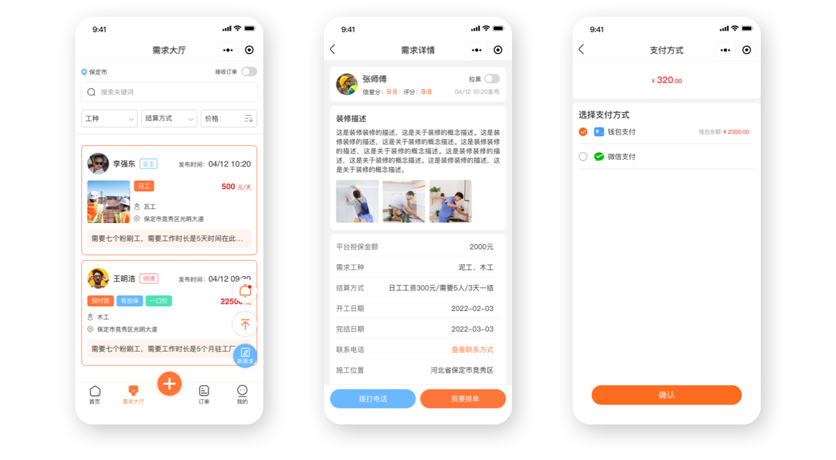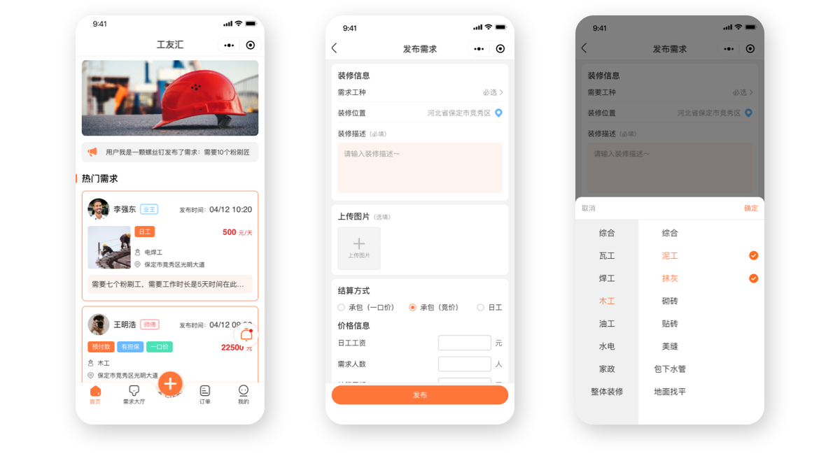 需求大廳頁(yè)面展示包括選擇城市、搜索框、可以按照所需要的工種類別(木工、瓦工、油工……)、結(jié)算方式、價(jià)格等進(jìn)行篩選。