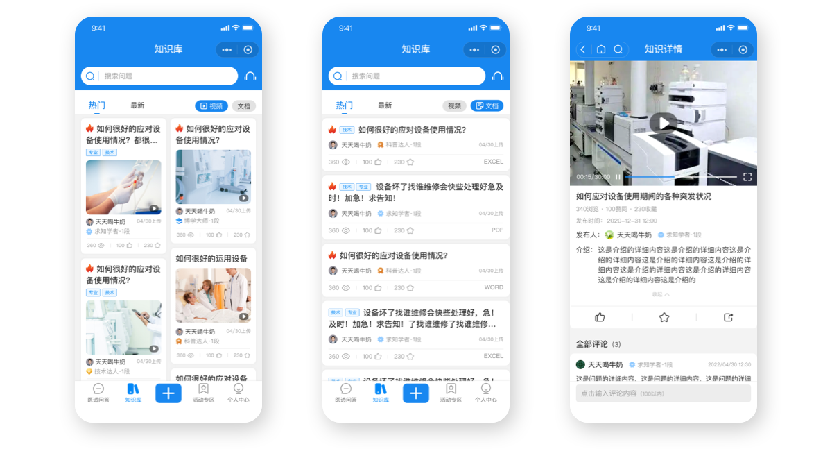 醫(yī)透研習(xí)社知識庫頁面主要是可以進行視頻類別、文檔類別的展示,也包括熱門知識庫、最新知識庫。