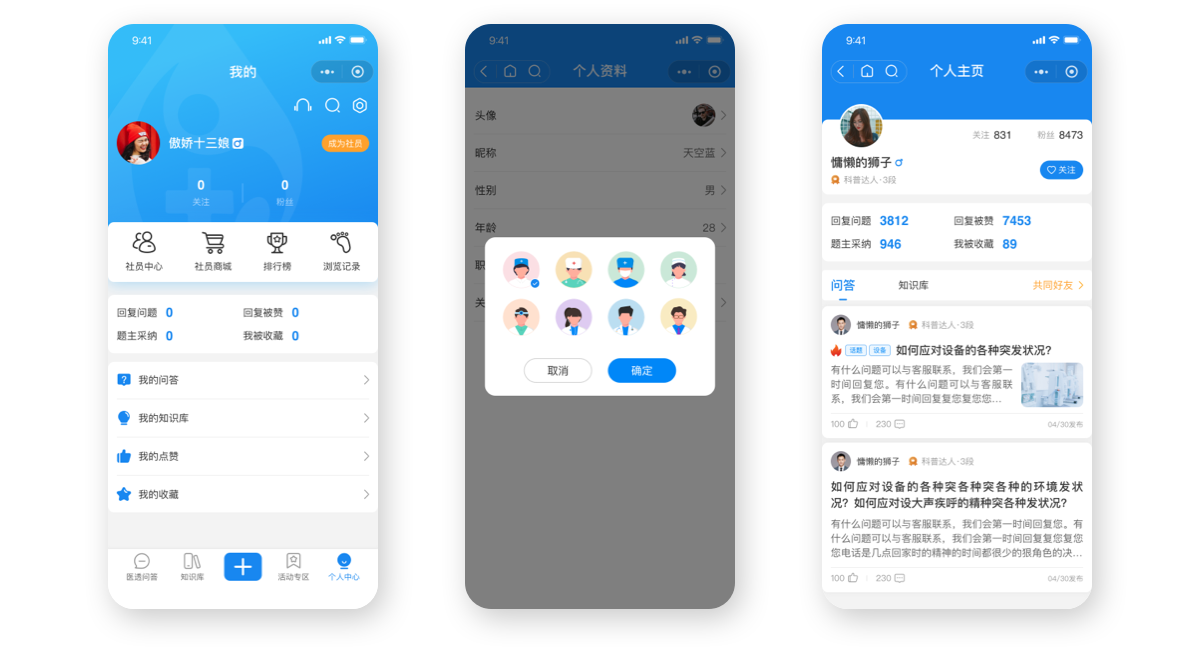 醫(yī)透研習(xí)社我的頁面,可以展示我的頭像、級別、工作筆記、社員中心、社員商城、排行榜、瀏覽記錄以及 我的回答、我的知識庫、我的點贊、我的收藏等。