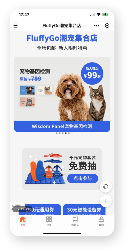 毛球總動員商城頁面可以跳轉(zhuǎn)進入寵物商城頁面,包括商品分類,主要有狗狗精選、貓咪精選、潮人精選等,包括加入購物車、我的頁面等。