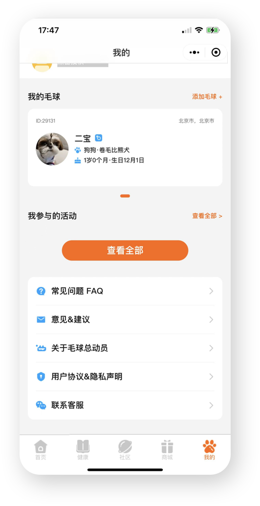 毛球總動員社區(qū)我的頁面呈現(xiàn)的主要是寵物個人信息(類別、年齡、生日等)、我參與的活動以及問題、客服、關于、用戶協(xié)議等常規(guī)模塊。