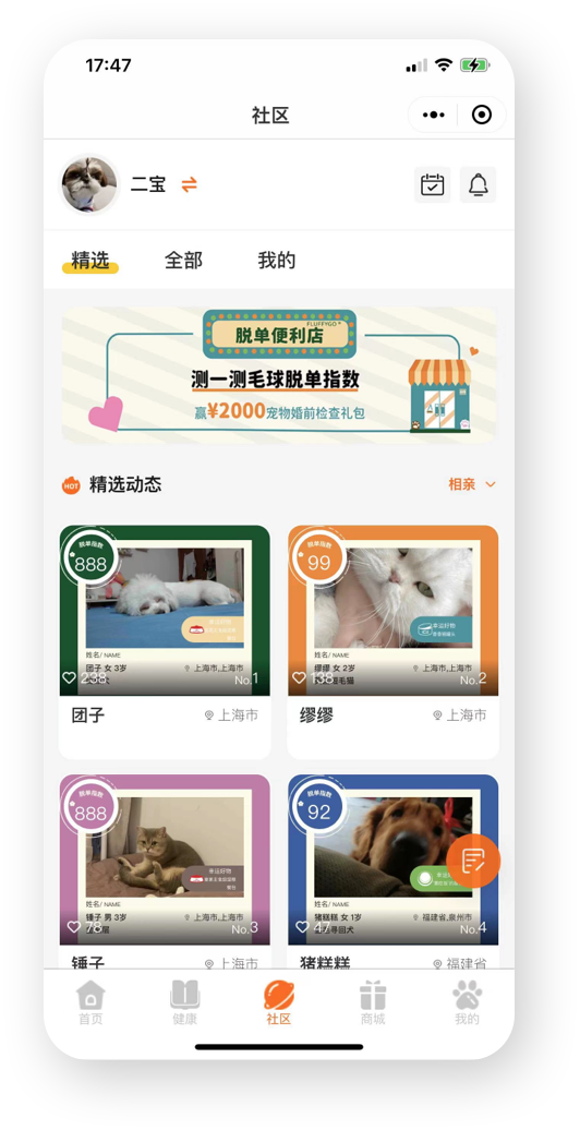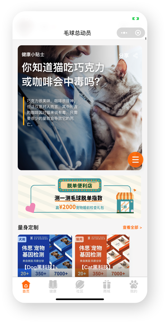 毛球總動員首頁呈現(xiàn)的有輪播圖、脫單便利店、量身定制的寵物基因檢測、寵物護理專業(yè)課程、寵物相關的熱門活動等。