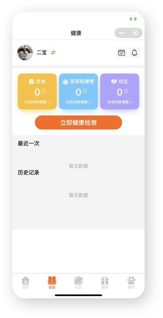 毛球總動員健康頁面呈現(xiàn)的有飲食模塊、尿尿便便模塊、狀態(tài)模塊、以及健康檢測歷史記錄。