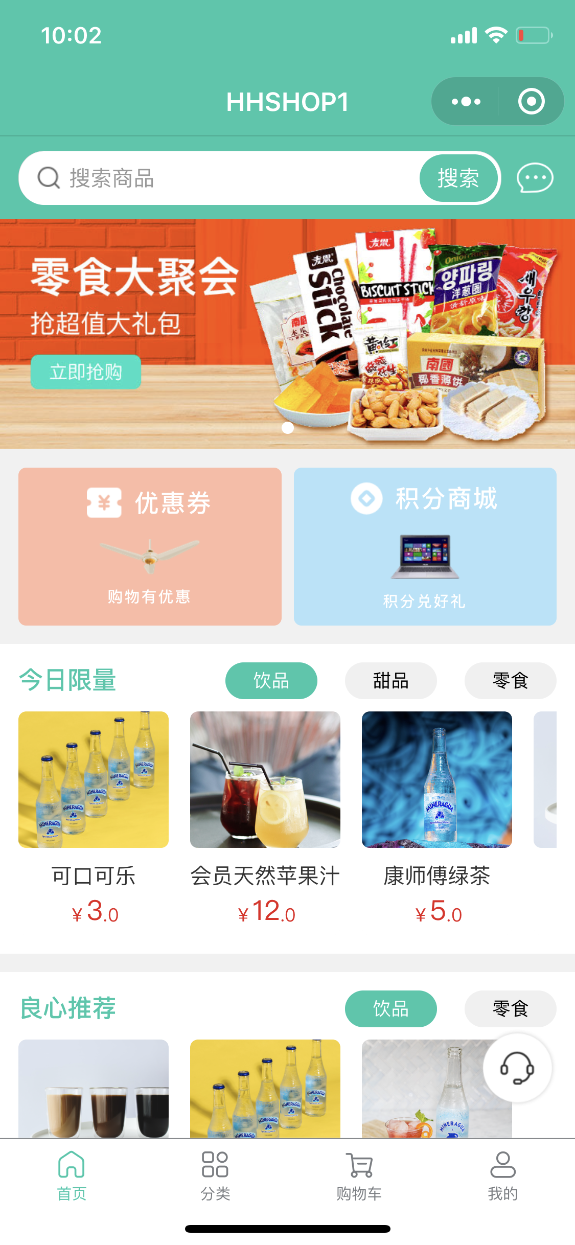 便利店小程序主要包括“首頁、分類、購(gòu)物車、我的”四個(gè)分區(qū)。在“首頁”板塊,首先有banner展示區(qū),主要播放的是便利店優(yōu)惠活動(dòng)的海報(bào),特色商品、上新商品的宣傳圖等,板塊較大,圖片展示清楚,有利于提高活動(dòng)的曝光率,吸引用戶參與。另外,商家可以通過后臺(tái)更改banner區(qū)的展示圖片,方便用戶及時(shí)了解店鋪的活動(dòng)和其他信息。