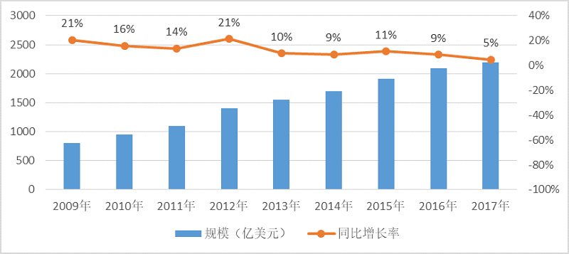 在全球信息化浪潮的強烈推動下,軟件產業(yè)在全球范圍內已經(jīng)發(fā)展成為一個規(guī)模龐大、最具活力的產業(yè)。2009年,全球軟件外包規(guī)模在800億美元,到2017年,全球軟件外包規(guī)模達到2200億美元。全球軟件外包行業(yè)經(jīng)過快速增長狀態(tài)后,目前增長率趨緩,增長率仍然在接近10%左右。