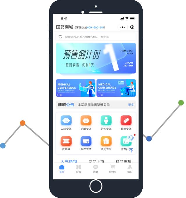 國藥商城小程序開發(fā)包括兩部分內(nèi)容:小程序用戶端功能界面和小程序服務(wù)端接口。國藥商城小程序用戶端主體包括“首頁、分類、消息、購物車、我的”五部分,