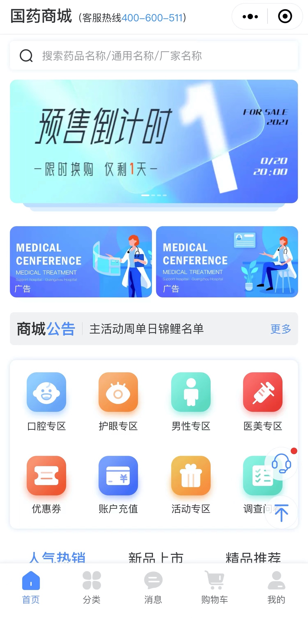首頁是國藥商城小程序最重點(diǎn)的板塊,涵蓋多種功能,能最大程度上滿足消費(fèi)者的消費(fèi)需求。并且,首頁界面分區(qū)明確,簡介大方,消費(fèi)者進(jìn)入首頁時(shí),不僅瀏覽方便,選購也更加快捷。