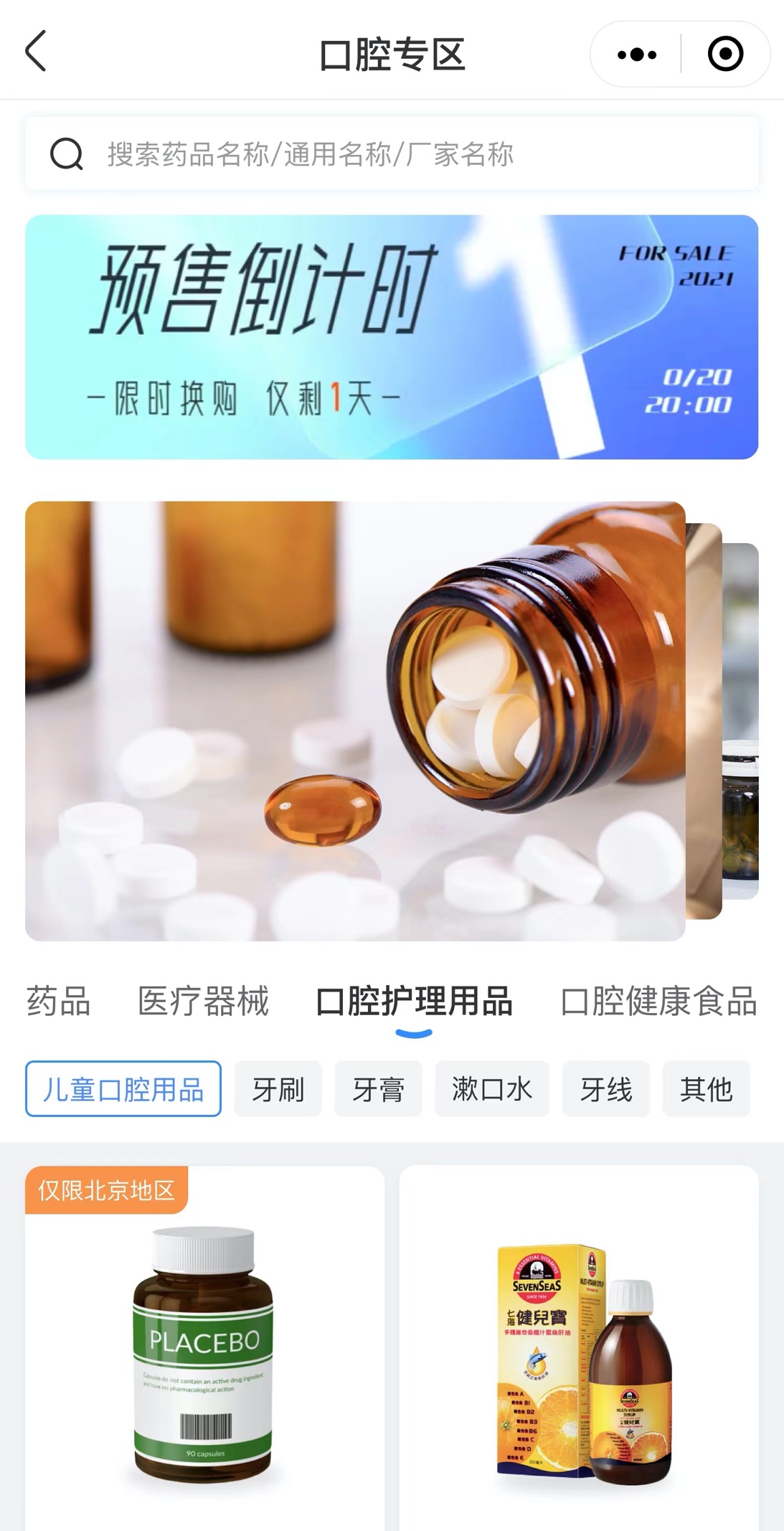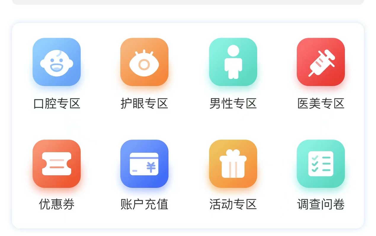 首頁里的專區(qū)板塊主要包括口腔專區(qū)、護(hù)眼專區(qū)、男性專區(qū)、醫(yī)美專區(qū)、優(yōu)惠券、賬戶充值、問卷調(diào)查幾大板塊,分類明確,功能齊全。由于藥品專區(qū)布局大致相似,這里主要選擇一下關(guān)鍵的專區(qū)進(jìn)行詳細(xì)的介紹。